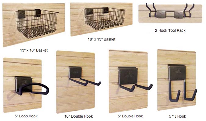 Slat-Wall and 7 Slat-Wall AccessoriesEndless Possibilities... Slat-Wall is the perfect addition to your garage. Whether above your workbench or on a wall, 5 Slat-Wall Hooks and 2 Slat-Wall baskets give you the ultimate in storage flexibility. 18" x 13" Basket 13" x 10" Basket 2-Hook Tool Rack 10" Double Hook 5" Double Hook